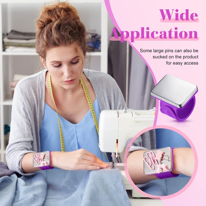 - Practical Pincushion: the silicone magnetic pin wristband measures approx. 9.44 x 2.36 inch, which can fit the wrist of most people, bringing much convenience in daily uses; The square shaped pincushion on the bracelet is magnetic, so it can serve as a pin holder for organizing small things, like rat tail combs, hairpins and hair clips and so on when you are braiding your hair, it can also organize some pins stably when sewing