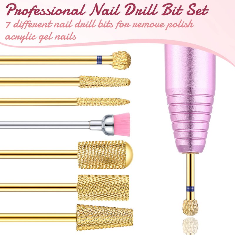 7 Pieces Nail Drill Bit Set, Tungsten Carbide Drill Bit Set, Cuticle Drill Bits Nail Bits for Nail Drill 3/32 Inch for Nail Bit Manicure Pedicure (Gold)