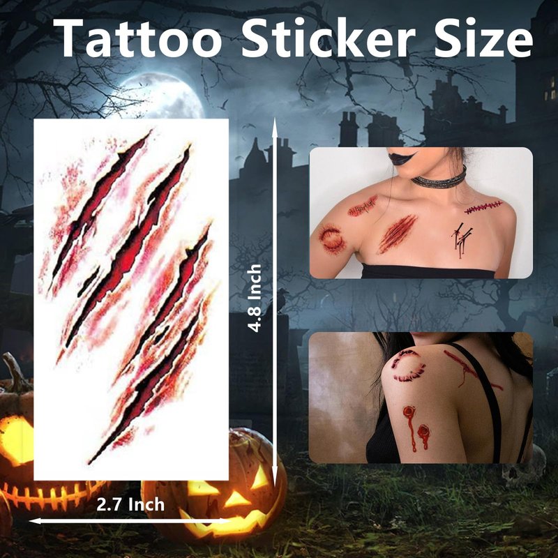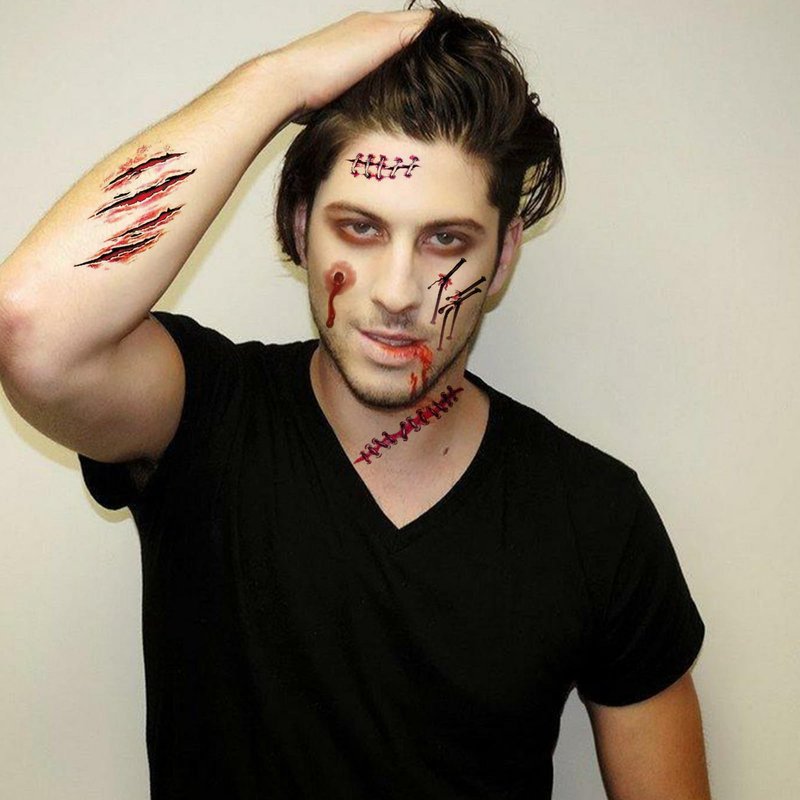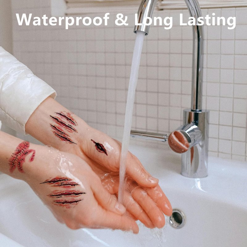 - Realistic Blood Zombie Tattoos: The 3D design and clear ink makes scar wounds look more natural. You don't need to have great makeup skills, fake blood tattoos are easy to use,you can complete the perfect role play in seconds, variety exquisite fake wound temporary tattoo stickers,one pack for all your needs, giving you a better dress up experience.