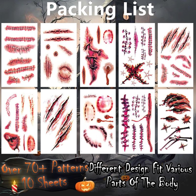 - Packing Include: 10 sheets halloween temporary tattoos with over 70 PCS fake scars designs. Measures 4.8*2.7 inches in length and width. Large size and horror realistic design,you can be applied to various parts of the body,face,arms,legs,shoulder,wrist,chest or anywhere you like.