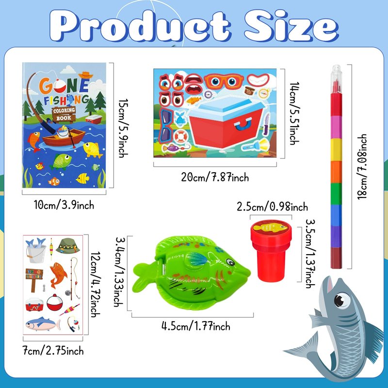 - Size Information:fisherman party supplies coloring books is about 4X6 inches,tattoo stickers are about 2.68 x 4.72 inches, and 8 different colors stacking crayons is about 7 inches,stampers are about 1 x 1.38 inches,DIY sticker is about 4 inch, fish is about 2 inch