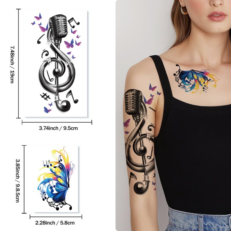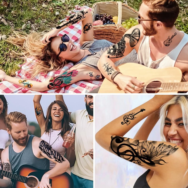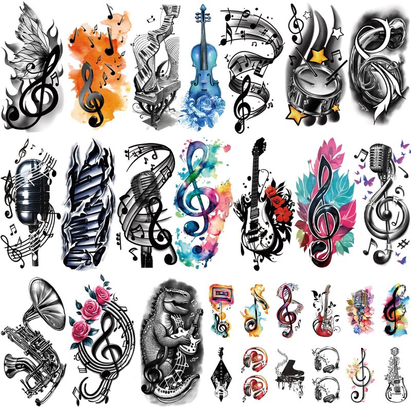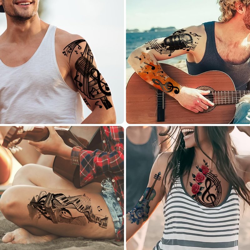 - 【Large Quantity Music Tattoo Stickers】77 sheets music theme temporary tattoo in different sizes and patterns, 17 PCS half arm sleeves large size and 60 PCS small size in total. These fake tattoos stickers, feature with music notes symbol, Guitar Violin Piano,etc. Half arm sleeves tattoo for men and women, kids and adults