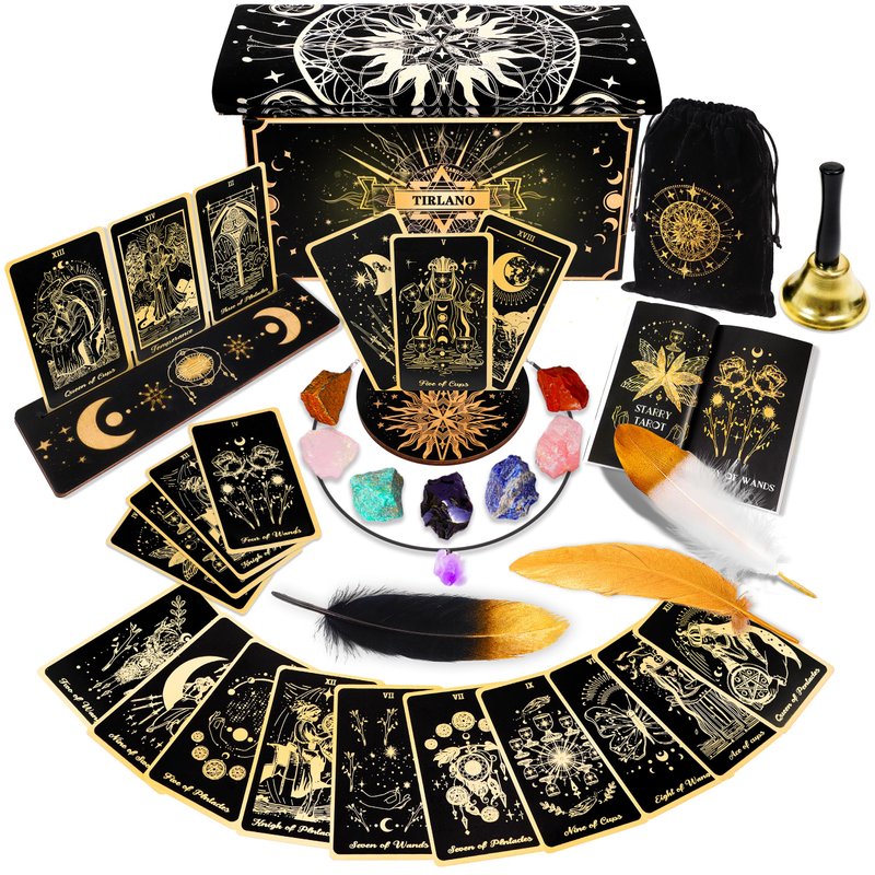 78 Tarot Cards with Guidebook - Tarot Deck Gift Set with Tarot Cloth & Holder, Chakra Stones & More, Black Tarot Cards Deck Fortune Telling Game Craft Cardboard for Beginners and Expert Readers