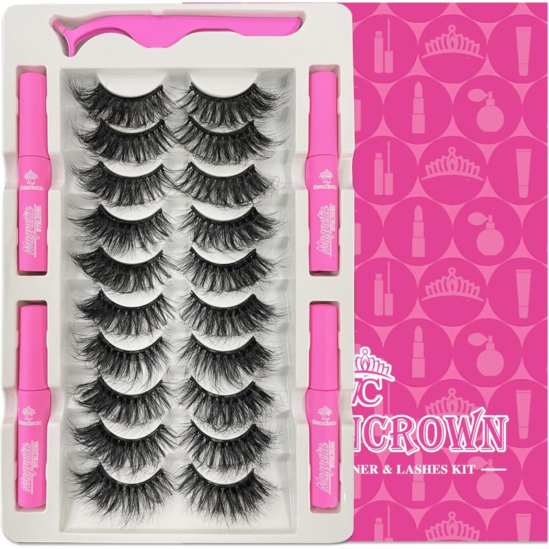 7C SevenCrown Magnetic Eyelashes with Eyeliner Kit, Fluffy Mink Lashes Cat-Eye Look 18-21MM Wispy Long 8D Luxury Volume Fake Eyelash 10 Pairs Cruelty-Free&Vegan