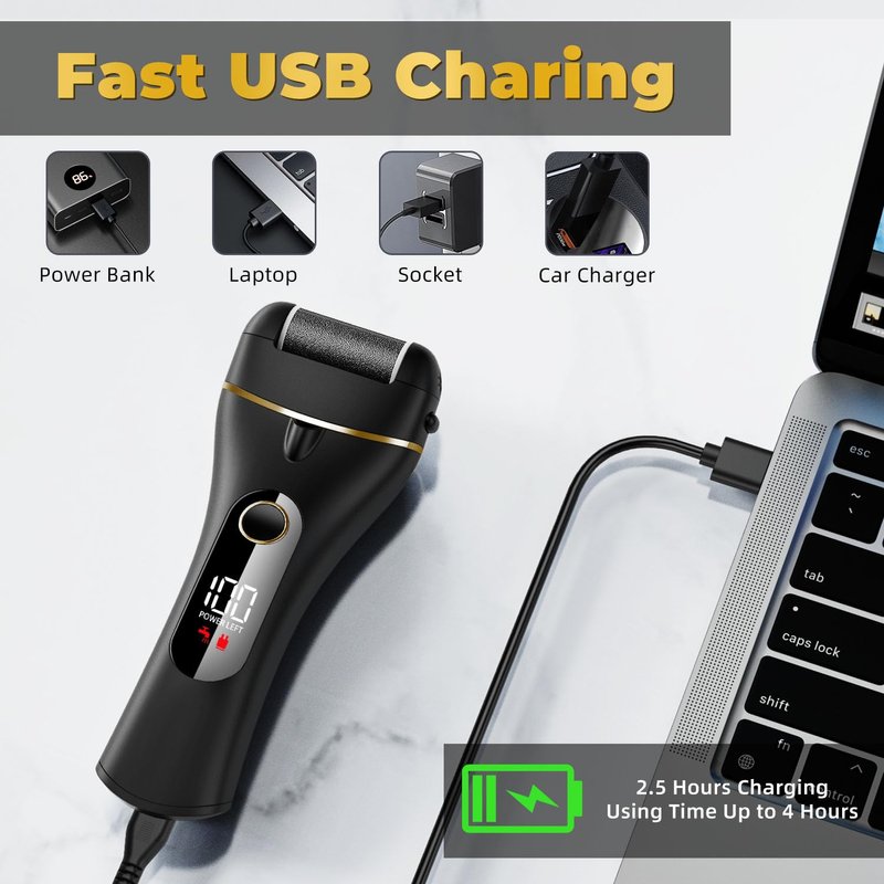 - Rechargeable & LED Power Display: Equipped with a rechargeable battery and an LED power display, this electric feet callus remover can be fully charged about 2.5 hours per session and you can see the power level on the LED display.