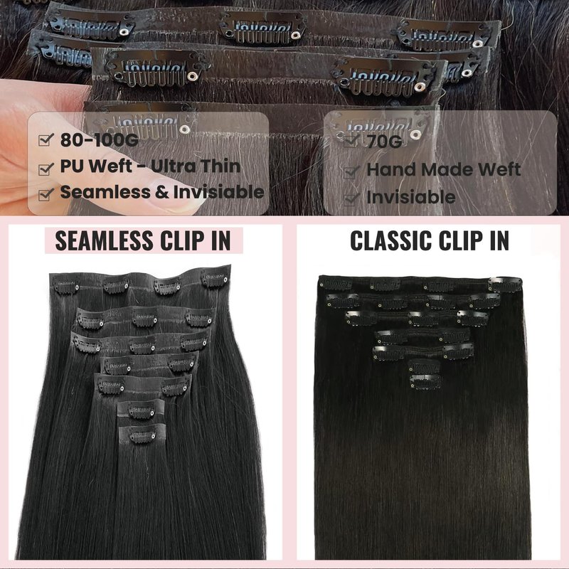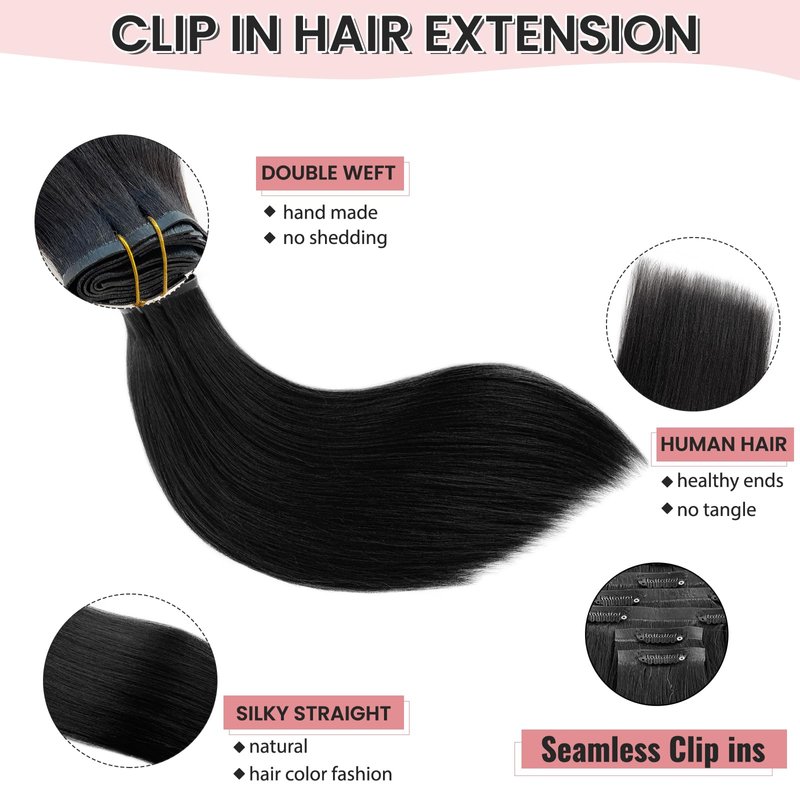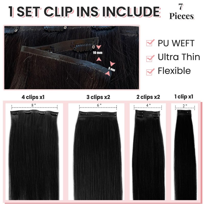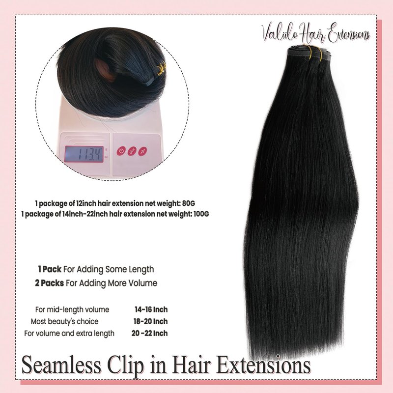 - 【Jet Black Human Hair Clip in Extensions 7 PCS】Valiilo clip in hair extensions are made with a thin silicone-weft base that lays flat against your head and lets you feel more comfortable. Valiilo clip in hair extensions available in 6 lengths: 12'', 14", 16", 18", 20", 22", 7pcs a set with different widths. Usually 1 pack can be used for adding volume, 2-3 packs are recommended if prefer thick hair.