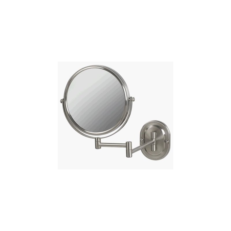 Beautiful Nickel Finish. Mirror on Both Sides. Elegantly crafted, 8" full 7X power magnification mirror on one side, true- view on the other. The fine mirror head is mounted on an adjustable swing-arm that will extend up to 13 inches. When the mirror is not in use it stores flush to the wall. Color: Nickel Diameter: 8 in Magnification Power: 7 X