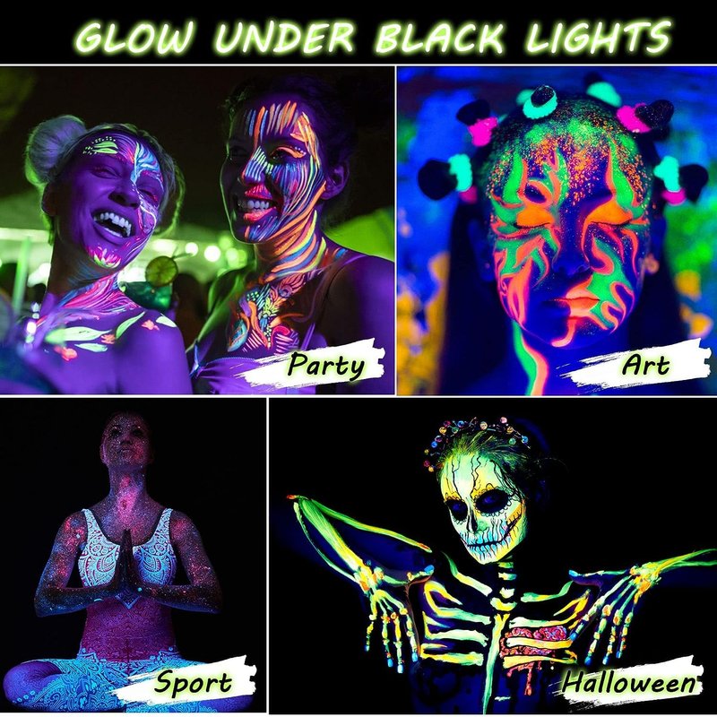 - GLOW FACE BODY PAINT UNDER UV BLACK LIGHTS - NEED TO USE WITH UV LIGHT, 8 colors glows brightly under UV Black lights(Only blue and purple are weak fluorescent colors), they will make you shine and dazzling in the dark. Easy-to-wash and smooth application are perfect for face paint from kids to adults. During the day time, this paint is bright and neon, while does't glow under under UV blacklights.