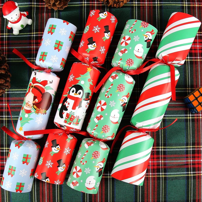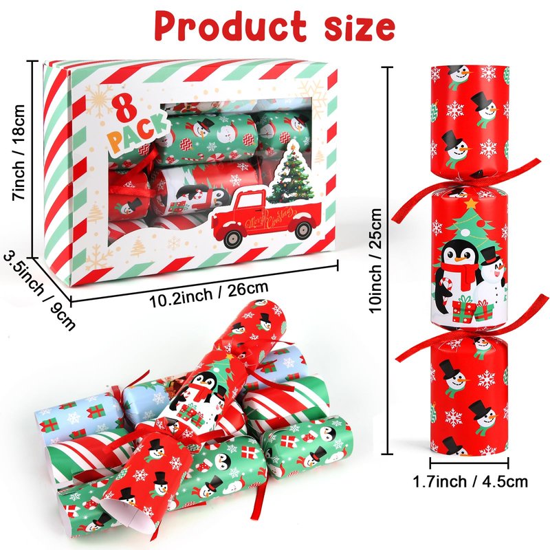 - [ Christmas Super Value ] Christmas party table favors set includes 8 packs of no-snaps party favors with cute Christmas designs. Each party favor contains a party paper hat, a Christmas joke paper and a random gift inside