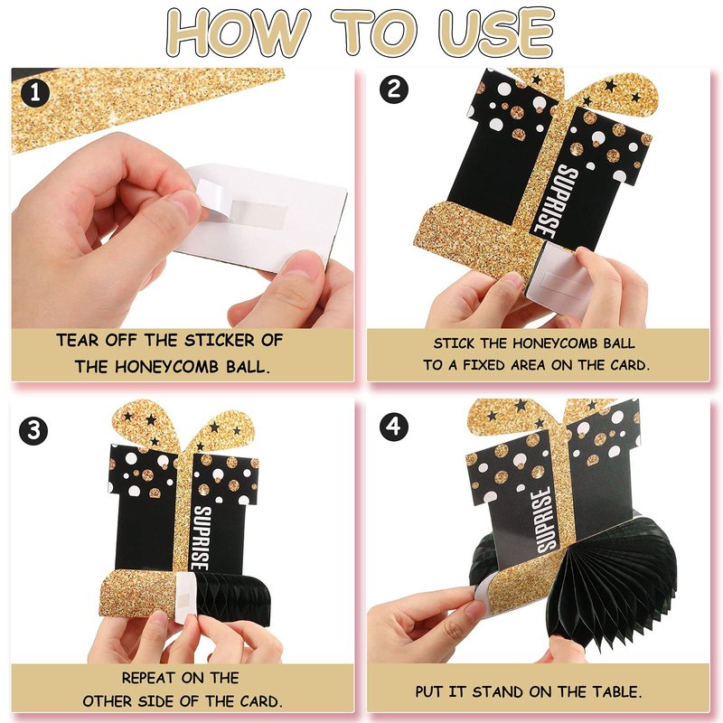 - How to use: firstly, tear off the sticker of the honeycomb ball, and then stick the honeycomb ball to a fixed area on the card, next step is repeat on the other side of the card, finally put it stand on the table, they very easy to use and save a lot of time in decorating