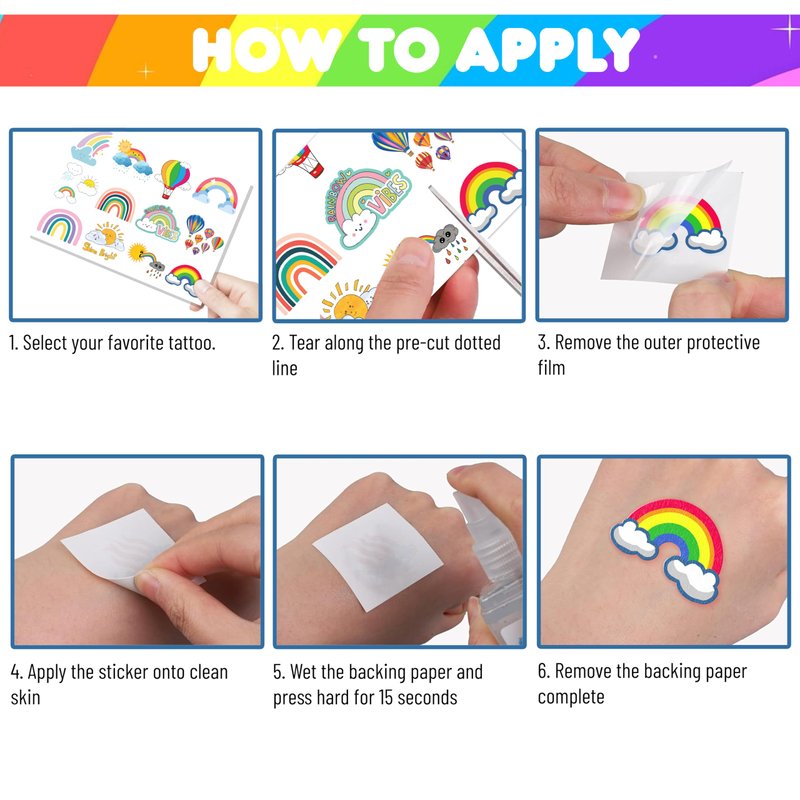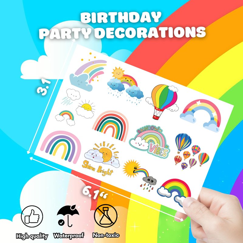 RAINBOW PARTY DECORATIONS: RAINBOW tattoos pertaining to our popular collection will accommodate children’s expectations that they always anticipate to have them at Birthday parties, Christmas, and special celebrations. Each tattoo set covers 8 sheets in total with 96 Pcs. The dimension of each sheet is 6.3*4.7 inches, including tattoo pieces that have proportions reasonable for adults to kids. These tattoos designed with colorful styles promise to develop the living atmosphere for parties .RAINBOW PARTY SUPPLIES FAVORS: RAINBOW tattoos stickers cover various color tattoos with the emerging appearance of sunshine, rain, cloud, sky, and RAINBOW at all. Most of these nature patterns are to the point for holding Birthday party and outdoor party that will be reasonable choices for kids who have their hobby in nature things. During the moments of party, children have no boredom at all replaced with cheer plus excitement when they play with our tattoos. SAFE AND HIGH QUALITY: Our temporary tattoos are made of environmentally friendly materials, and non-toxic. These tattoos are made of high-quality safety and green paper. USAGE: Firstly,you cut each tattoo out of the sheet and remove the piece of transparent paper.Next, you stick it on your hands, arms, face, or wherever you feel safe.You even can put it down on glass, suitcase, water bottle, luggage, laptop, case,etc.Thirdly, wet it with a few drops of water and wait for about 20-30 seconds, then remove the backing paper thoroughly. As a result, you have a velvety tattoo.As it is a temporary tattoo,you can remove it easily by using water, soap, or hand sanitizer. SATISFACTORY SERVICE: Not recommended for people with a history of sensitive skin. If symptoms appear, stop using immediately. Anyway, if you have trouble using our product, please contact us. We will make sure to solve problems and help you have a fantastic buying experience.