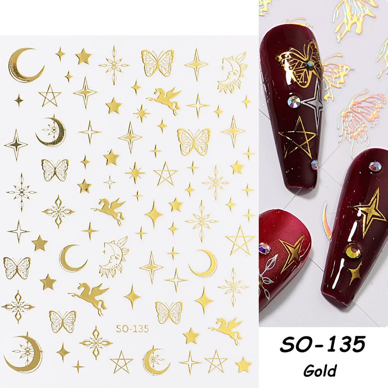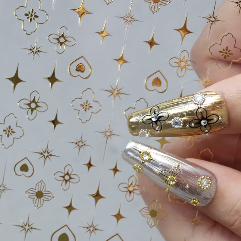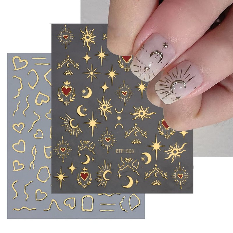 - Package Contain: You will get 8 sheets delicate gold nail stickers,various styles of stars, love heart, moon, flower, geometry etc to design patterns can be used for nail decoration.