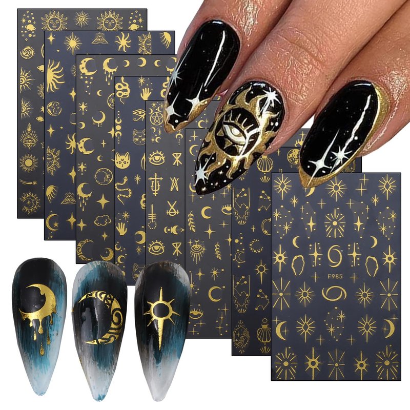- Nail Art Sticker Set: You will get 8 sheets delicate gold nail stickers. Each sticker is designed with different elements: unique sun,moon, stars,snake, cat, leaves etc to vintage patterns can be used for nail decoration.