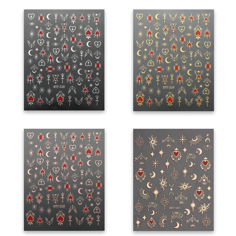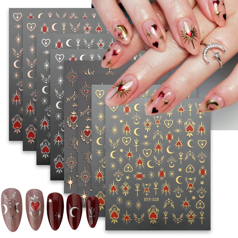 8 Sheets Gold Sun Star Nail Art Stickers Bronzing Moon Nail Decals 3D Self-Adhesive Red Heart Nail Stickers Exquisite Glitter Rose Gold Silver Star Moon Design Women Girls for DIY Nail Decorations