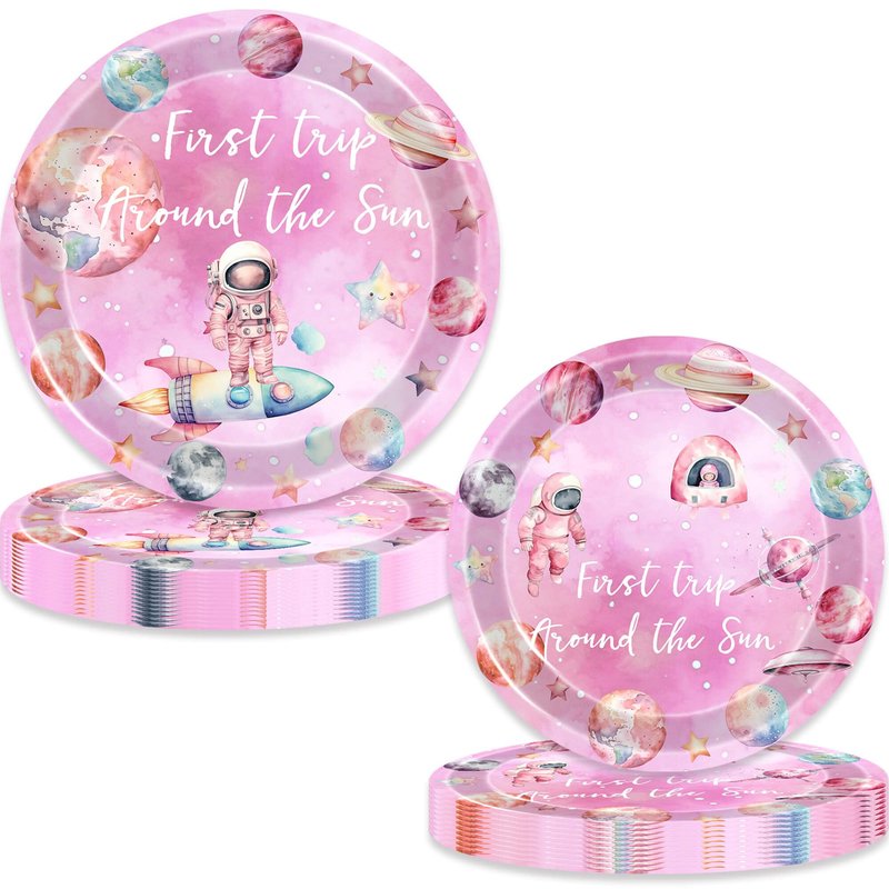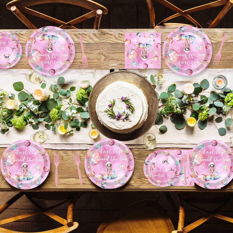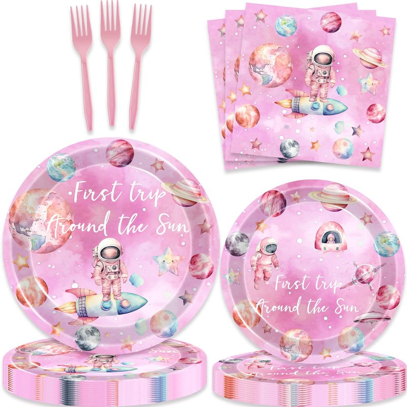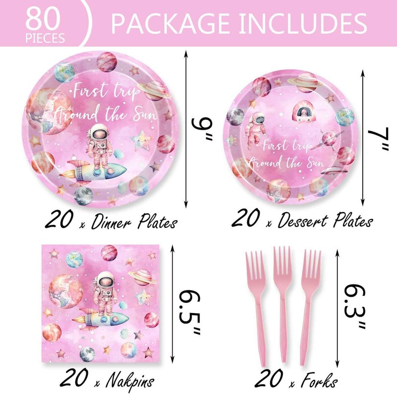 80 Pcs First Trip Around The Sun Birthday Decorations Outer Space Girls 1st Birthday Paper Dinner Plates Napkins Forks Dinnerware for Space Theme Girls Baby Shower 1st Bday Party Favors Supplies