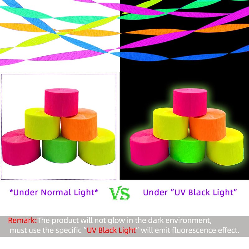 - 【All OCCASIONS 】Our luminous Crepe Paper Streamers perfect for blacklight dark glow party decorations, they will glow in the black light,birthday party,anniversary,festival celebrations, blacklight party.which is very suitable for your neon theme or luminous birthday party.