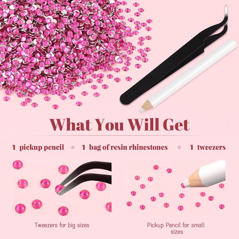 - 💎PACKAGE CONTENT -- The package contains approx. 8000 pcs of 3mm-SS12 (0.12") bling-out resin rhinestones (Hot Pink). The large amount will support you to fulfill a number of your wonderful DIY decoration ideas. Additionally, 1 tweezers and 1 pickup pen are included for easily picking up of glittering gems.