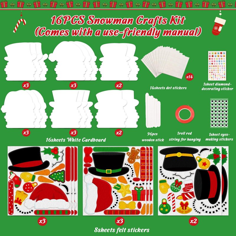 - Festive Snowman-Themed Crafts: This kit includes materials to create 16 festive crafts, featuring 6 different snowman designs, ready for kids to assemble into unique holiday decorations