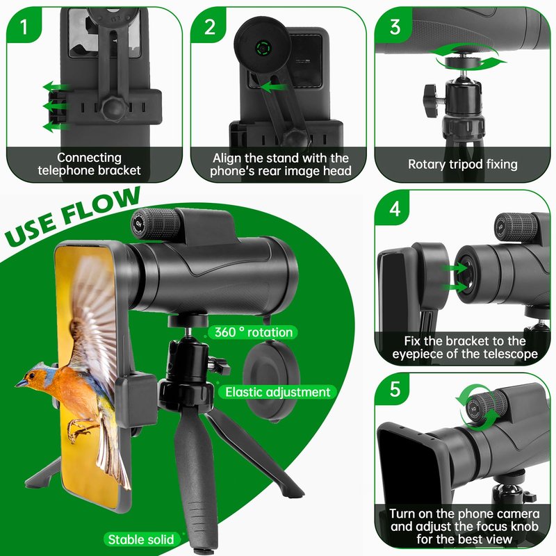 - 【A Reliable Partner for a Long Time to Come】-Solid, the rubber coating of the monocular with smartphone adapter features a textured surface for no-slip gripping. Waterproof and fog-proof, the shockproof birdwatching monocular can be used in humid environments. Featuring a secure grip, the ergonomically designed monocular with camera can be the perfect gift for someone traveling or wildlife enthusiasts.