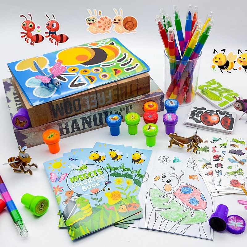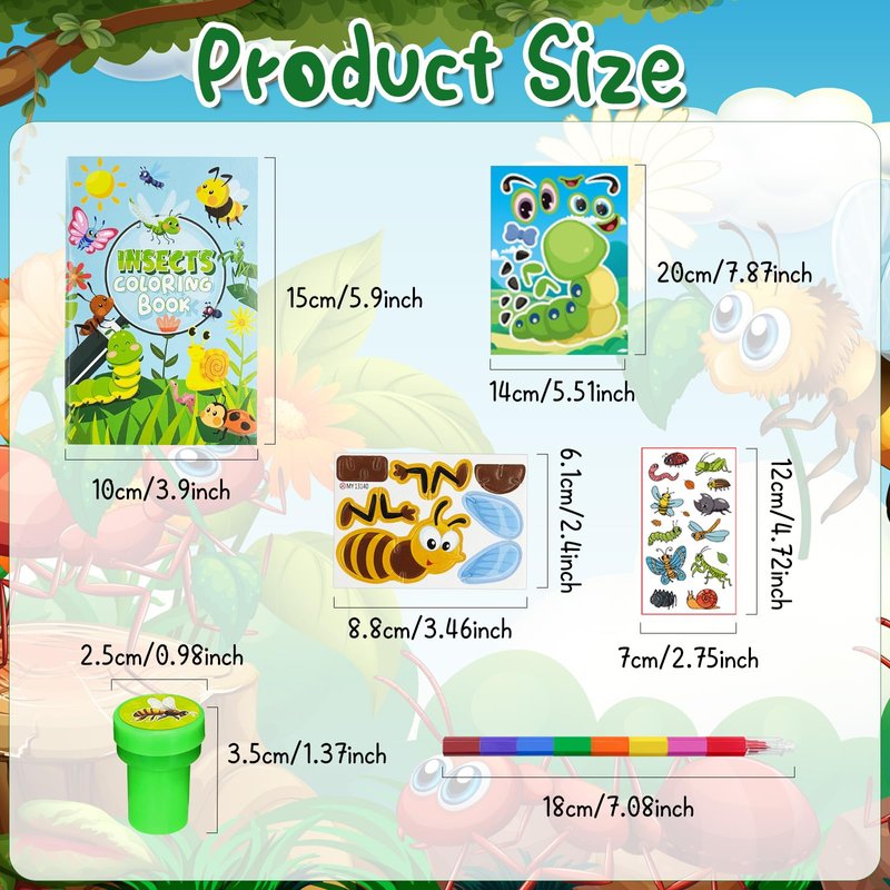 - Size Information: Insects party favors supplies gifts coloring books is about 4X6 inches,tattoo stickers are about 2.68 x 4.72 inches, and 8 different colors stacking crayons is about 7 inches,stampers are about 1 x 1.38 inches,DIY sticker is about 4 inch,puzzle gift is about 2 inch after assembled