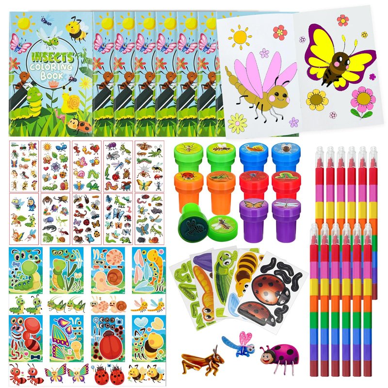 - Insects Bugs Party Favors Set: our bugs coloring books with stacking crayons set includes 12 coloring books(12 pages per book), 12 rainbow stacking crayons(8 colors),12 tattoos, 12 stampers, 12 DIY Art Craft stickers, 25 puzzles gift, sufficient quantity, and various styles enrich your Insects Bugs Party