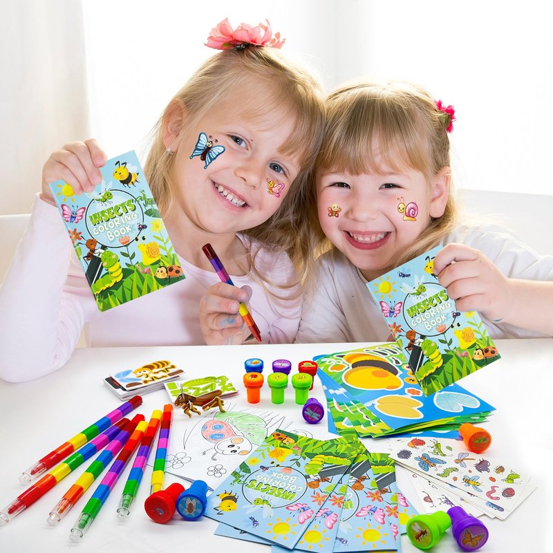 - Creative Pattern Design: our insect party favors goodie bags fillers are bugs themed coloring books and DIY stickers,butterflies, ladybugs, dragonflies, bees,caterpillar and so on;These insects art coloring books will create spring summer atmosphere, suitable as gifts of insects bugs party