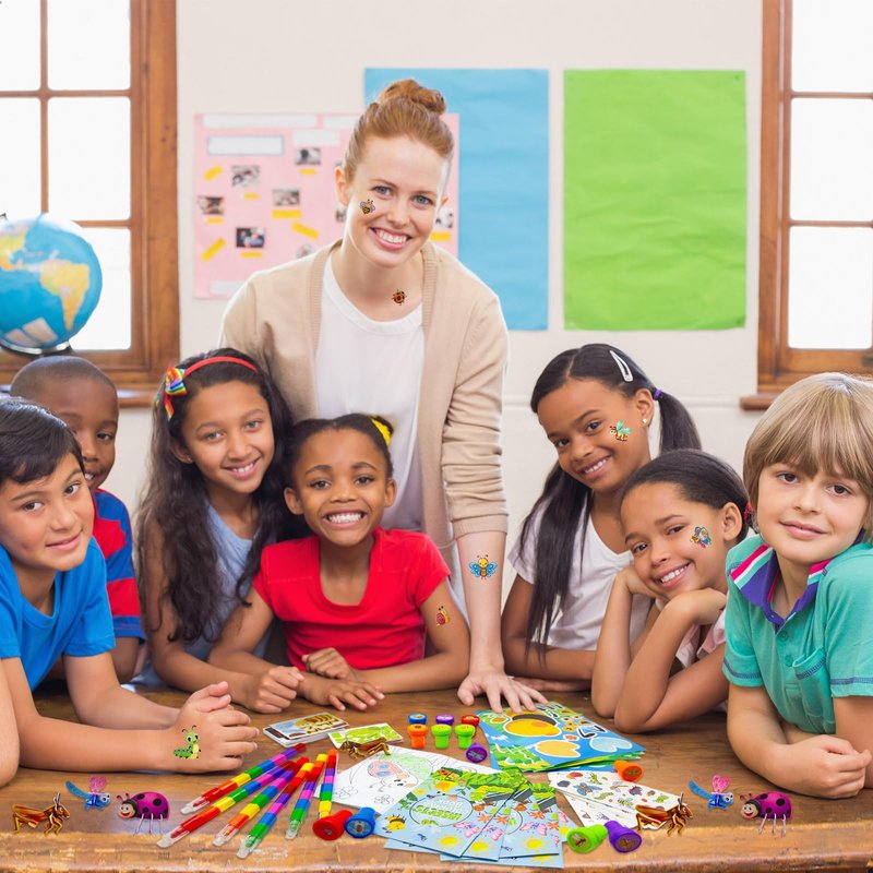 - Safe Materials: our spring summer insects party favors set are quality, made of quality materials, and safe with smooth surfaces; Tattoos can be easily removed with makeup remover,and our stacking buildable 8 colors crayons are made of paraffin and plastic; squishy pinch and stamps are made of plastic, other stickers are made of paper, nontoxic, safe material, safe for children to use