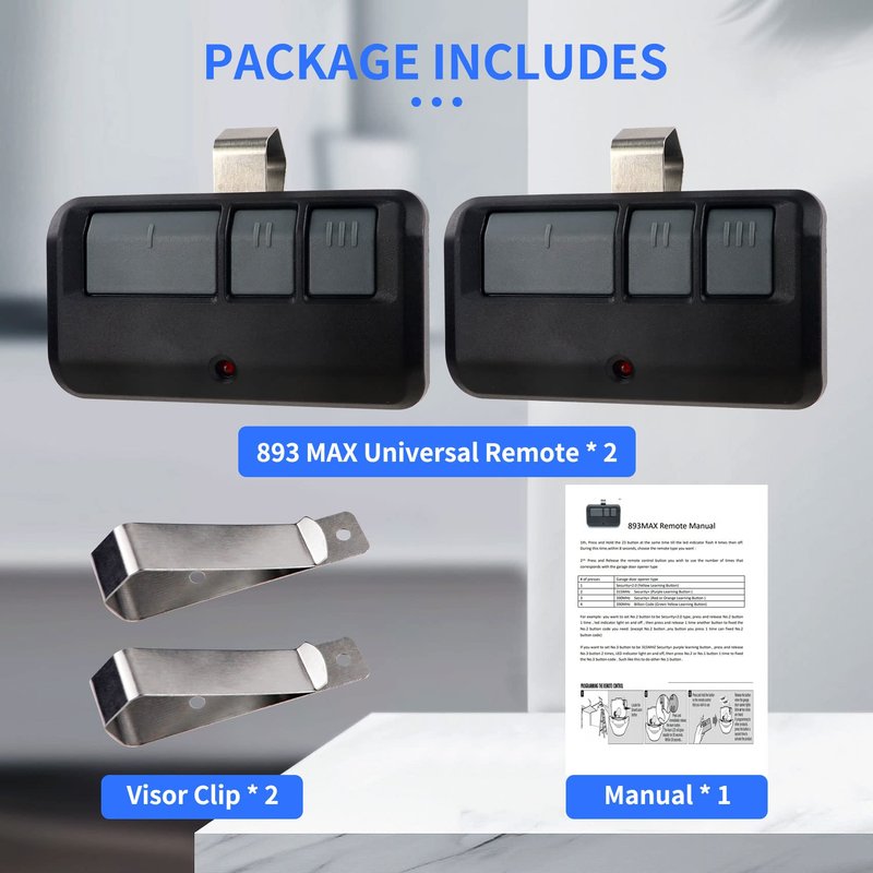 - Upgraded design: 893max garage door opener remote have further remote control coverage, stronger signal transmission, working distance up to 100 feet. Convenient and versatile, it is your must-have garage remote control alternative.