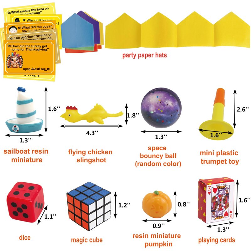 - 8 PCS different toys prefilled, such as playing cards, resin miniature pumpkin, space bouncy ball (random color), Flying Chicken Slingshot, magic cube, dice, Mini Plastic Trumpet Toy,Sailboat Resin Miniature