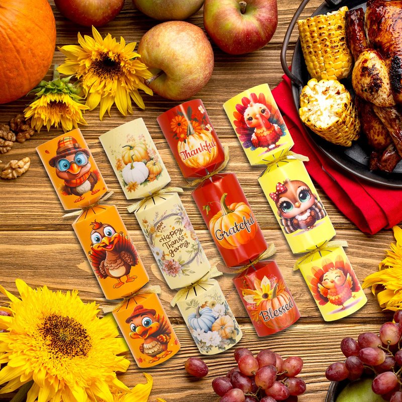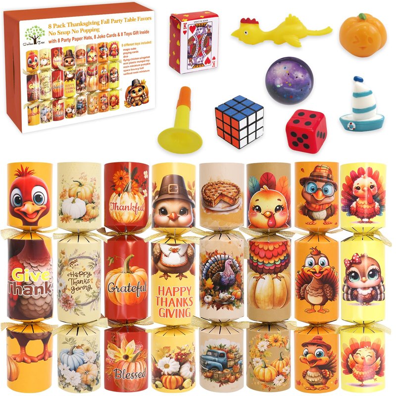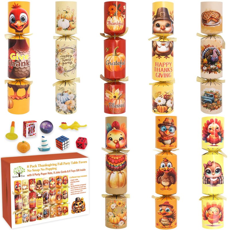- What you get: 8pcs Thanksgiving Crackers Poppers, No Snap No Popping, each Cracker prefilled with Party Hat, Joke card & small Gift toy Inside, great as Party Table Favor Games,Thanksgiving family activities prize