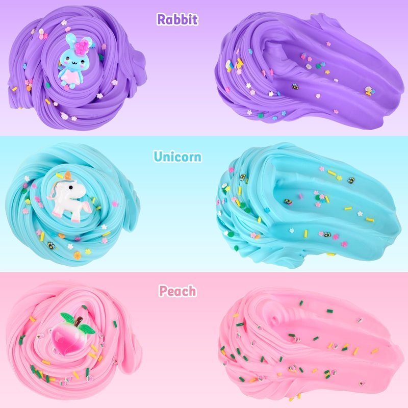 - 8pcs butter slime kit, with bunny, peach, unicorn, coffee cup, rich colored, super soft and stretchy, great party favor for kids 6 7 8 9 10 11 12 years old