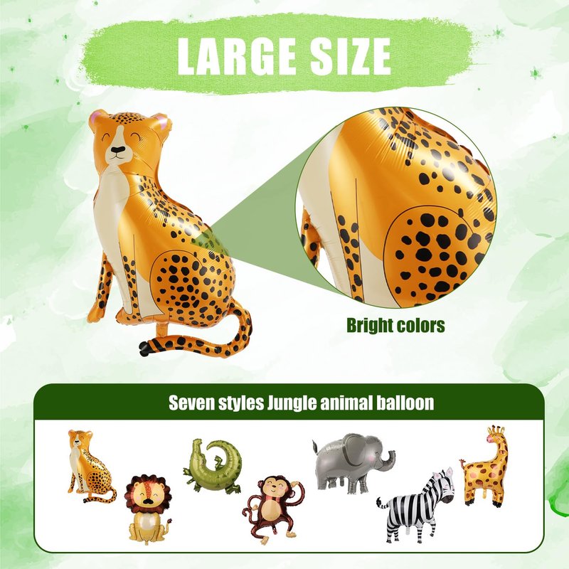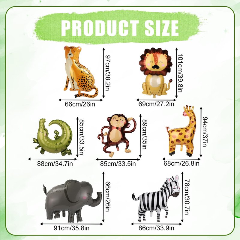 - Product Size: Each style balloon size is as follows: the monkey is about 85x89cm/33.5x35in; elephant is about 91x66cm/35.8x26in; zebra is about 86x78cm/33.9x30.7in; leopard is about 66x97cm/26x38.2in; crocodile is about 88x85cm/34.7x33.5in; giraffe is about 68x94cm/26.8x37in; the lion is about 69x101cm/27.2x39.8in and the number balloon is about 101cm/39.8in.