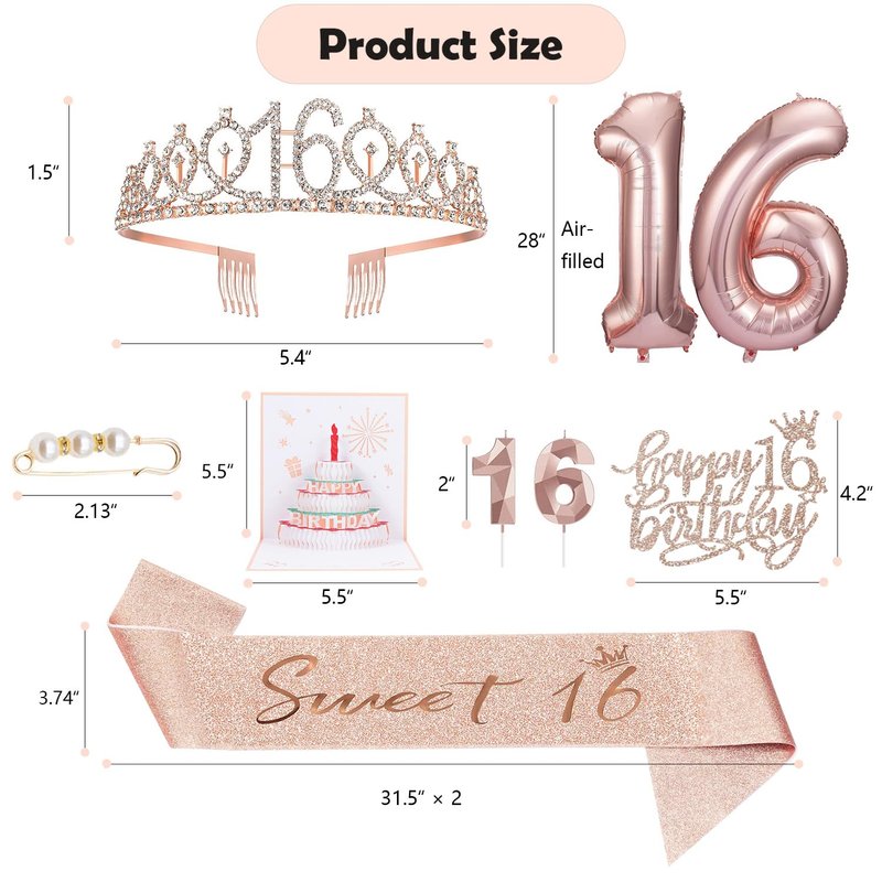 - 16th Birthday Decorations for Girls: Glittery 16th tiara/crown *1pc, “Sweet 16” sash *1pc, Happy 16th birthday cake topper *1pc, pearl pin*1pc, 1+6 numeral candles *1set, 1+6 numeral balloons *1set, they are exquisitely packaged in the carton.