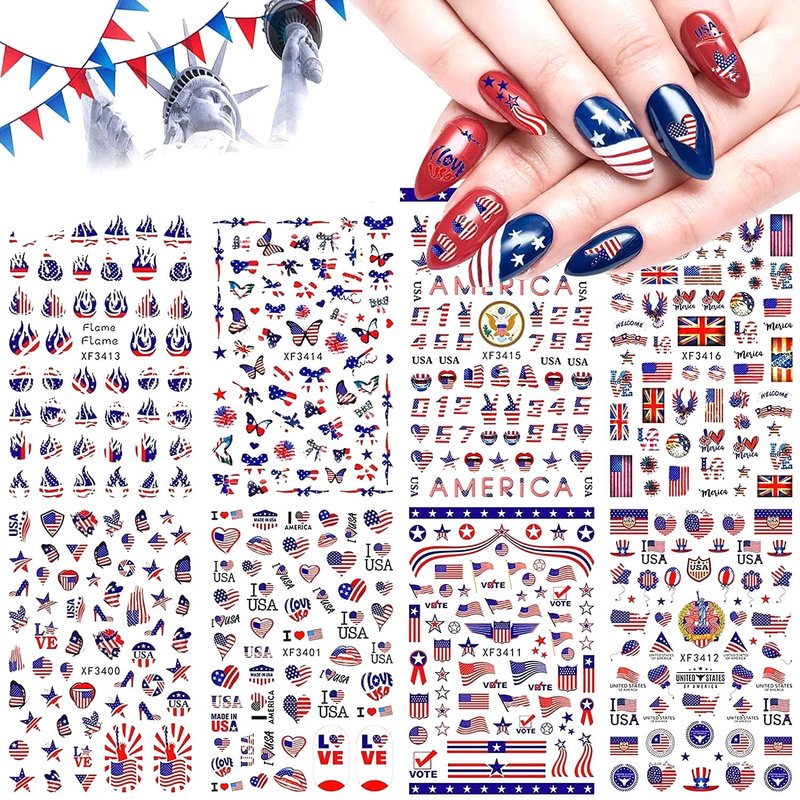 - 🔥Flag Day nail stickers: The package comes with 8 sheets July 4 Nail Art Stickers. various patterns for your choice, such as the American Flag, flame, and alphabet National emblem patterns with red, blue, and white colors. each paper size 3.54 x 3.15inches.