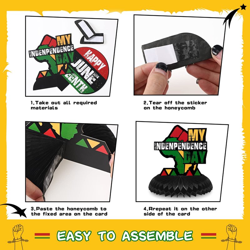 - How to Use: these Juneteenth themed party decorations have an area where the honeycomb can be assembled; Tear off the sticker on the honeycomb, then paste the honeycomb to the fixed area on the card, and then repeat the above steps on the other side of the card