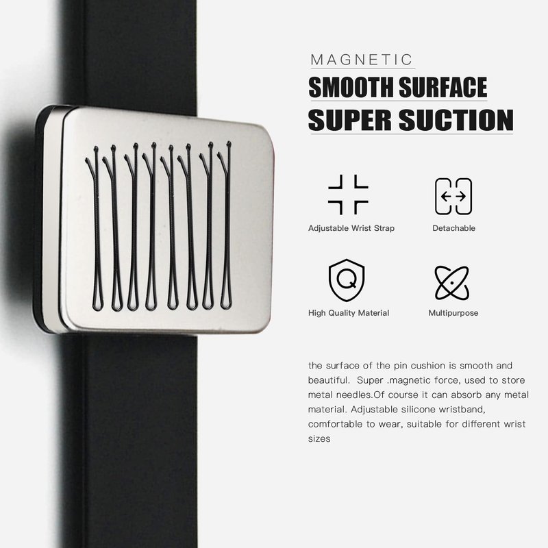 - Magnetic Sewing Pincushion: It is used to store small metal accessories such as metal pins, hair clips, etc. You can also apply gel on it. This is a very good tool for professional hairdressers.The wristband pin cushion holder is made of adjustable silicone wristband and iron. Suitable for most wrists.