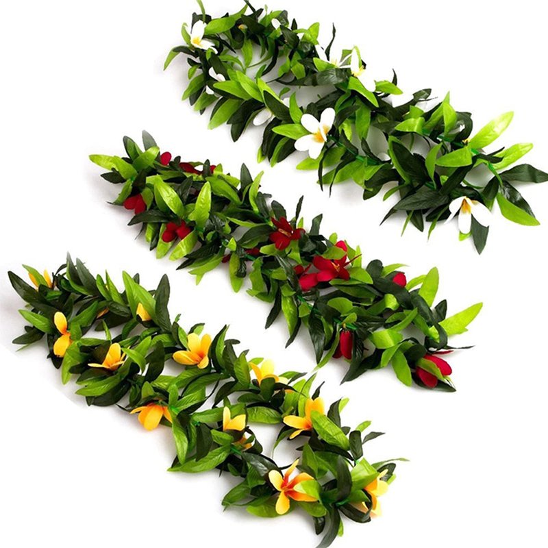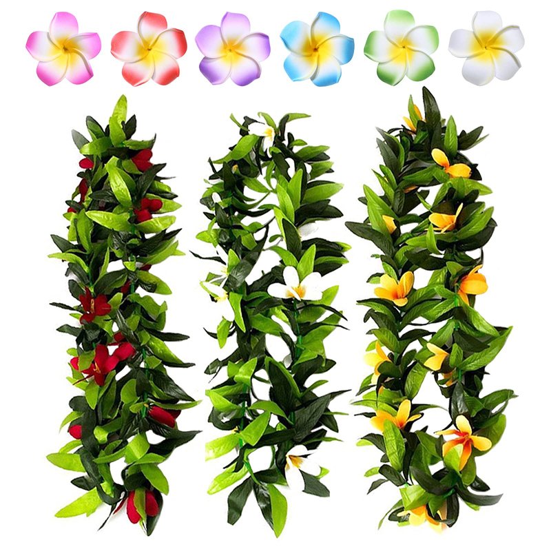 - 【HAWAIIAN LEIS HAIR CLIPS】 You will get 3 pcs green hawaiian leis with red, yellow, white flower and 6 pcs multicolor plumeria hair clips, adorable and attractive. It is in shape of green leaf and colorful flower, cute and pretty, sexy and nifty, naughty yet innocent, multiple temptation together wearing the leis set, suitable for dress, skirt, bikini and so on