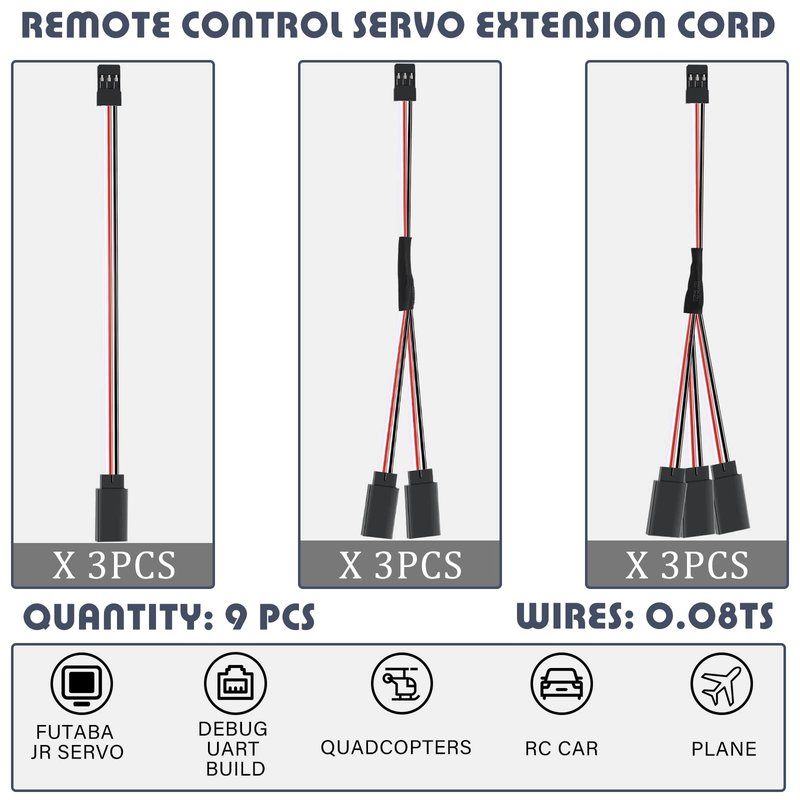 - Package includes: you will 9 pieces of servo extension cord, 3 pieces of male JST to female JR (Futaba) cable, 3 pieces of male to 2 female Y harness, 3 pieces of male to 3 female Y harness; Abundant quantity and diverse styles that can meet your various needs