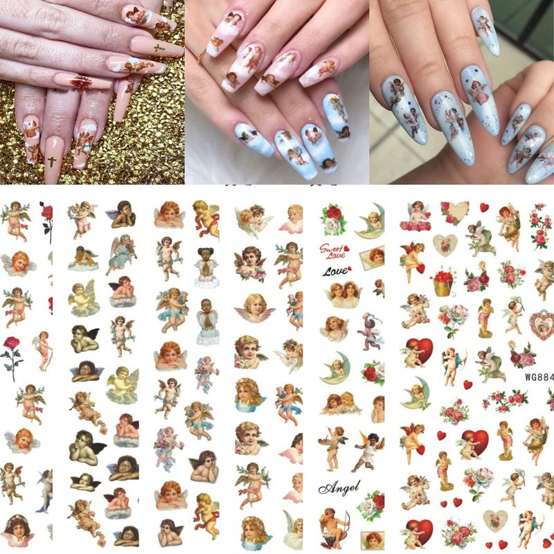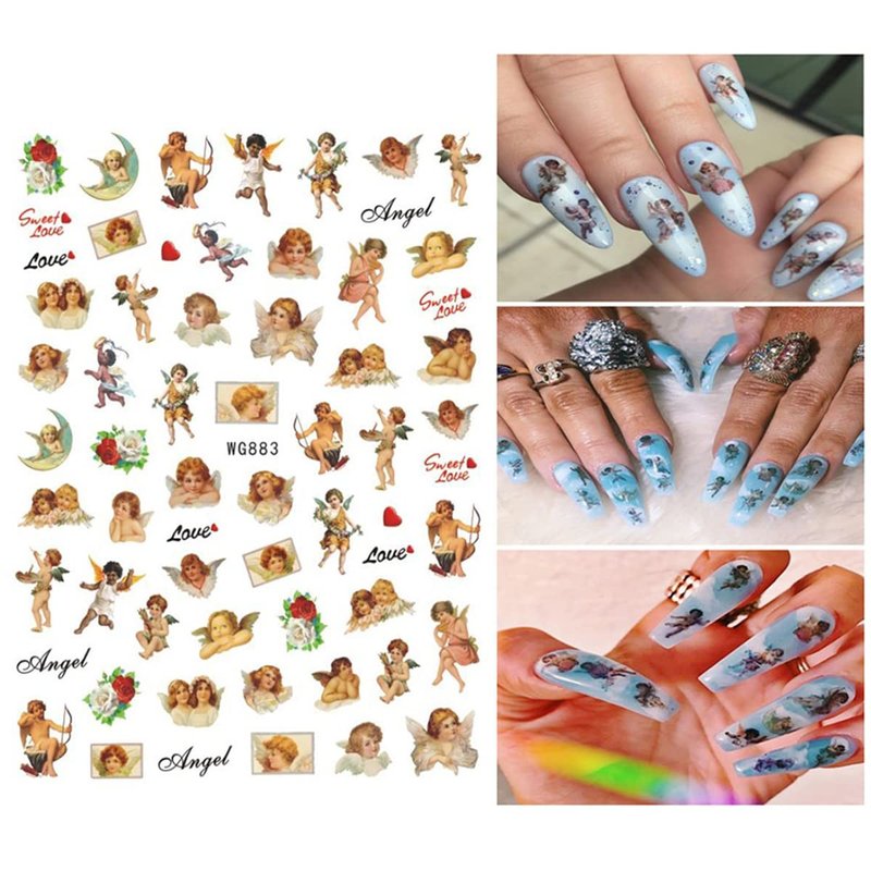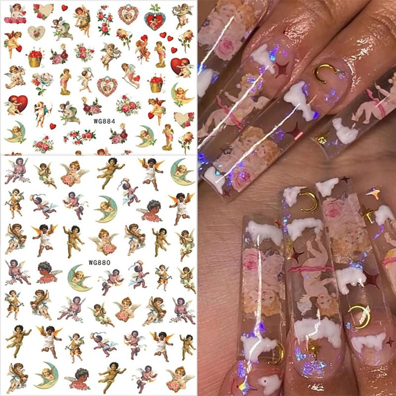 9 Sheets Angel Nail Stickers 3D Self-Adhesive Cupid Nail Art Stickers Eros Flowers Heart Nail Art Supplies Design Valentine's Day Nail Decals for Women Girls Acrylic Nails Manicure Decorations