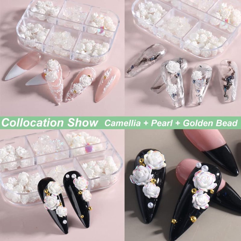 - 90PCS Nail Art White Camellia:1 Box 6 Grids camellia rose nails art charms are made of synthetic resin materials,have a 5D effect. You can match set gold beads and white pearl rhinestones or sequins to create charming nail decorations. They are lightweight and durable, easy to apply, not easy to fade or break, and can serve you for a long time. Camellia come with 2 sizes: Diameter 6MM 60PCS, 8MM 30PCS,Totally 90PCS.