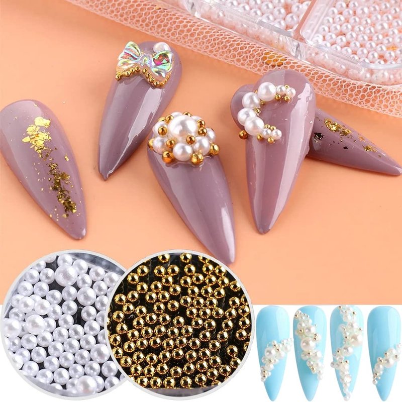 - 900PCS Nail Art Pearls And Gold Beads:Made of high quality glass and stainless materials, which exhibits hardness and is not easily broken. They will maintain long-lasting gloss and brightness on your nails and will not fade easily. Pearls come with 4 sizes: Diameter 1.5MM 150PCS, 2MM 150PCS, 2.5MM 150PCS, 3MM 100PCS,Totally 550PCS,Gold Beads come with 2 sizes: Diameter 0.8MM 200PCS, 1MM 150PCS,Totally 350PCS.