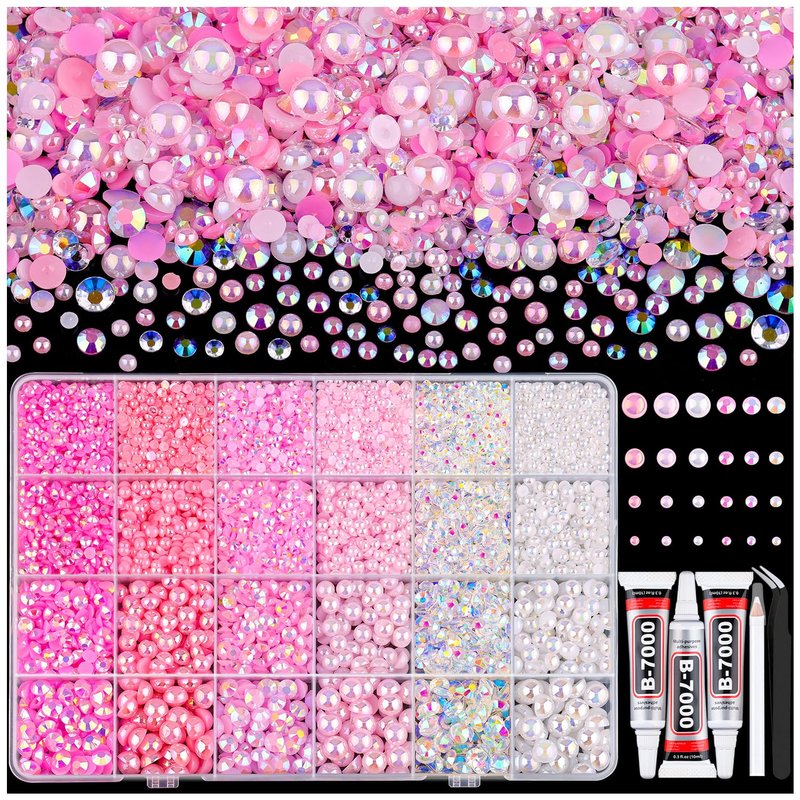 9000PCS Flatback Pearls and Rhinestones for Crafting, Pink White 3-10mm Resin Rhinestones and Half Pearls for Bedazzling, Nail Art and Dec with 3pcs B7000 Jewelry Glue, Tweezer and Pickup Pencil