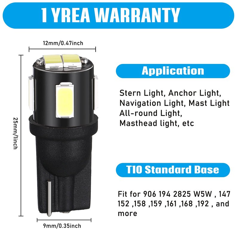 - Fitment: these 5630 LED T10 wedge base marine boat light bulbs are suitable for DC 12V system, they are compatible with T10, 906, 194, 2825, W5W, 147, 152, 158, 159, 161, 168, 192, and so on
