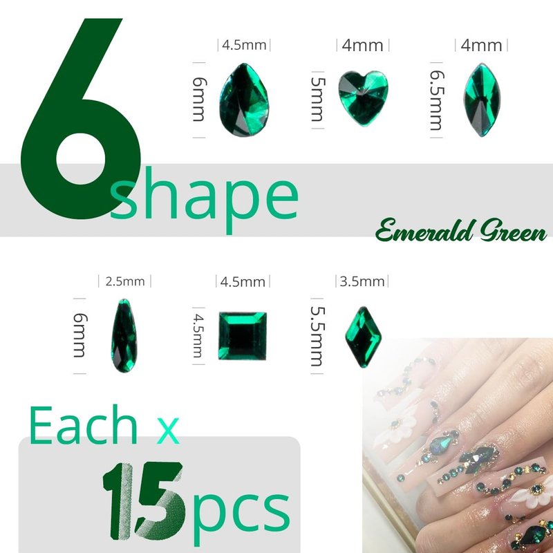 - ❤【6 Kinds Shapes Cute Small Flatback Emerald Green Rhinestones】6 kinds different kawaii shapes, each includes 15 pcs, total 90pcs. The shiny diamonds for nail stones are designed with different style, like heart rhinestones, rhombus rhinestones, Horse eye rhinestones, melon seed rhinestones, water drop rhinestones, square rhinestones. Emerald green crystal rhinestones are built-in flat backs can be easily applied to natural and artificial nails.