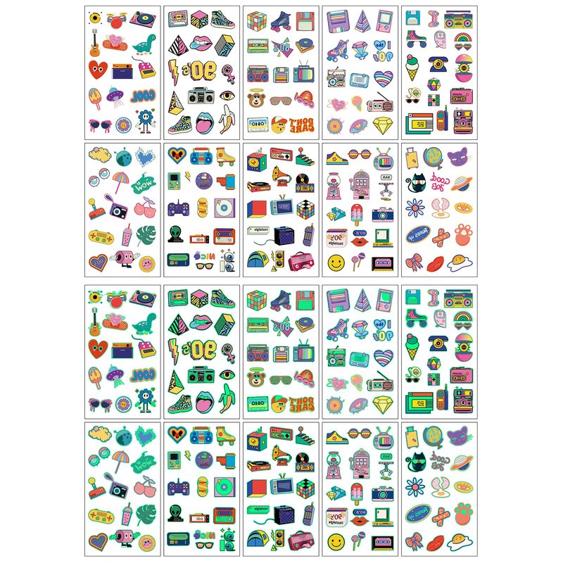 - 90s 80s Party Supplies: This luminous retro temporary tattoos featuring 10 sheets adorned with a total of 153 exquisite and lively designs. Each sheet measures 4.7 * 2.7 inches, The styles are very rich, and sufficient quantity is enough for your daily use and replacement.