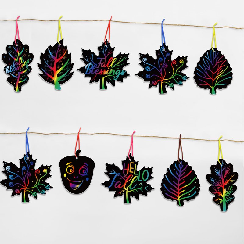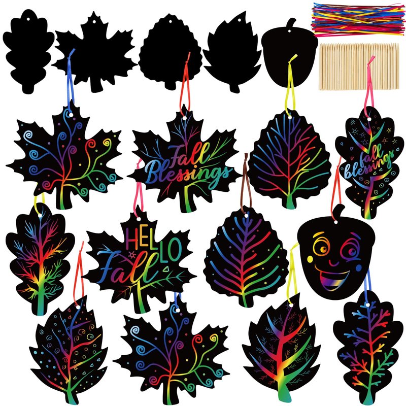 - Fall Craft for Kids:Our scratch art leaves start with a black surface, revealing vibrant rainbow colors when scratch 5 leaf shapes with fall-themed satin cords complement the colorful leaves, allowing for personalized, creative designs that reflect the beauty of the autumn season