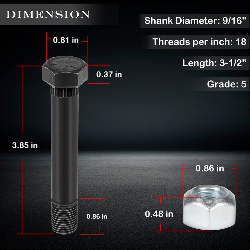 - Feature –Diameter: 9/16"; Threads per inch: 18; Length: 3-1/2", Grade: 5; 9/16-18 lock nuts