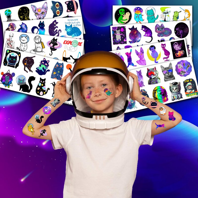 - Pattern rich: Funny Space Cat Cute Galaxy Cats Astronaut Star Temporary Tattoos for Kids include 8 Sheets 92 PCS, the size of each sheet is 6.1 * 3.1 inches. Having a variety of characteristics, shapes and vibrant colors can stimulate your children's imaginations and bring a creative atmosphere to your Space Cat Party.
