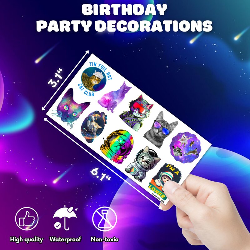 - Widely used: These : Funny Space Cat Cute Galaxy Cats Astronaut Star Temporary Tattoos pieces are suitable for many occasions such as birthday parties, birthday gifts, party decorations, gatherings and other special celebrations. It also can be applied on laptop, cup, luggage, phone case and so on which could make you look more impressive.