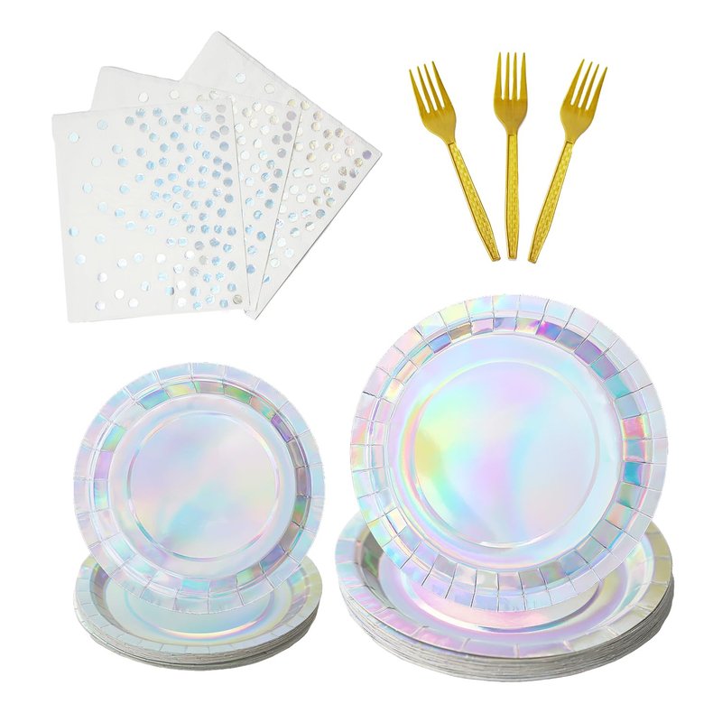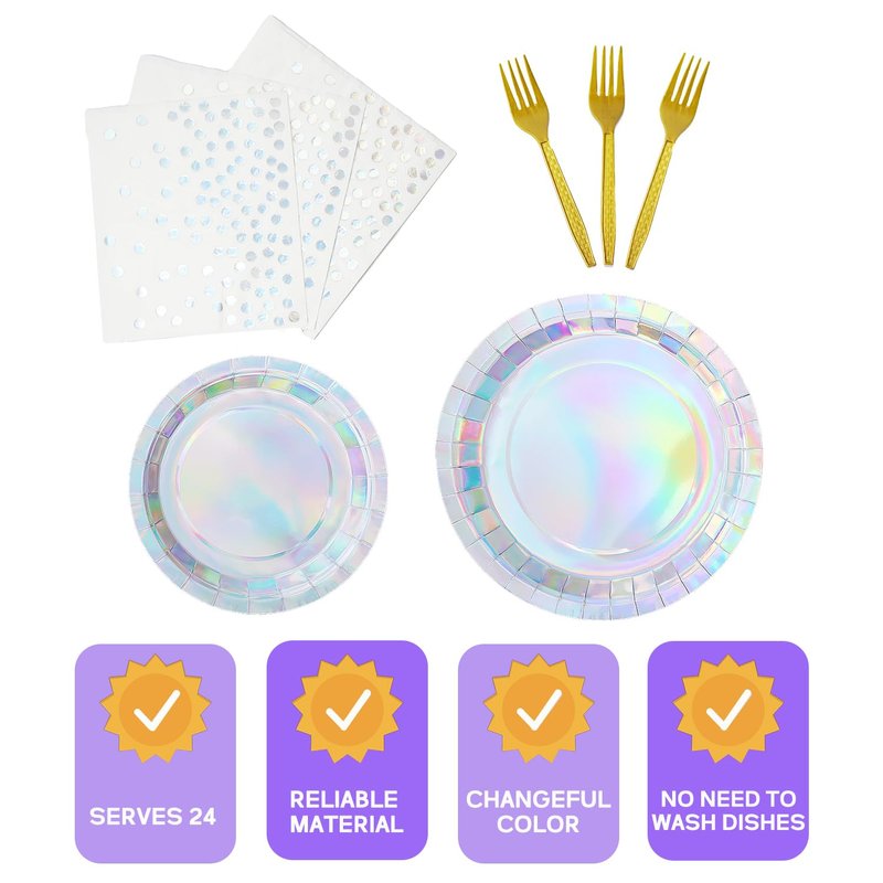 96 Pcs Iridescent Party Decorations Supplies Disposable Paper Dinner Plates and Napkins Forks Tableware Set for Mermaid Birthday Wedding Cocktail Party Serve 24